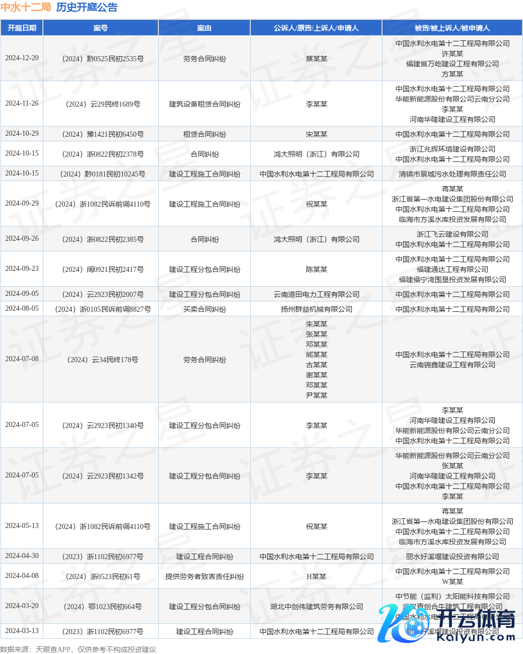 本站音尘,把柄天眼查APP表露,近日公布了一则中国水利水电第十二工程局有限公司动作被告/被上诉东谈主的开庭公告,留意实质如下: