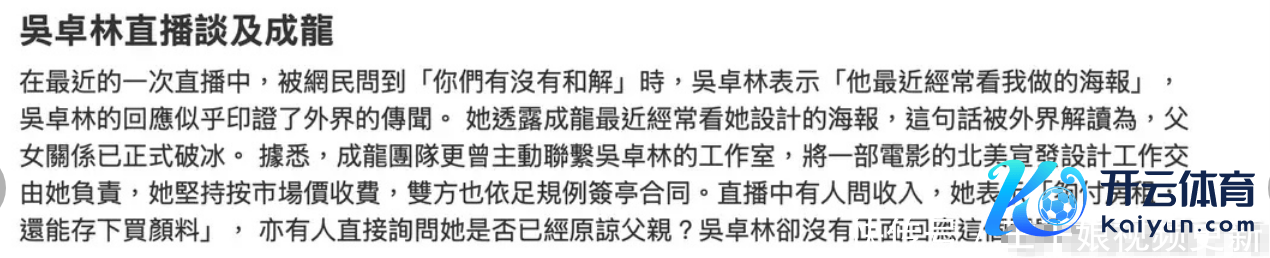 在近日的一场直播中,“小龙女”吴卓林苛刻谈起了我方的父亲开云体育(中国)官方网站,在被网友问到“你们有莫得妥协”时,她回复“他最近通常看我作念的海报”,天然莫得平直说起对方的名字,但不少网友还是默许他等于成龙。