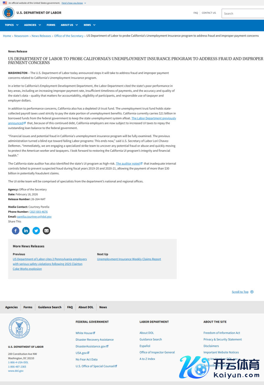 近日,劳工部阐扬通告向加州打法一支特意“突击队”(strike team),针对该州休闲保障(Unemployment Insurance,简称UI)推敲中捏续存在的失当支付、涉嫌欺骗以及系统性财务问题张开真切看望。