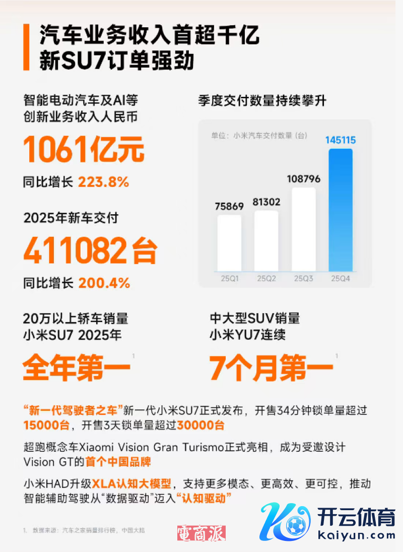2025年,小米汽车全年录用朝上41万辆。本年3月份发布的新一代SU7,只是开售34分钟锁单就摧毁了1.5万台,开售3天就朝上3万台